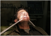 Die zwei Gruppen im Hospital wissen nichts von all dem und begegnen sich schließlich, um gemeinsam den Weg nach draußen freizumetzeln. Ab diesem Moment haut Seagal etwas mehr um sich, der Film gewinnt leicht an Tempo und das blutige Geschmadder könnte einschlägig vorbelastete Fans durchaus zufrieden stellen. Als Horrorfilm betrachtet kann AGAINST THE DARK etwas besser punkten denn als Actioner: Freunde früherer Seagal-Großtaten wie OUT FOR JUSTICE werden sich nicht heimisch fühlen. Ab und zu wird es regelrecht unheimlich, wenn etwa eine Zombiefrau wie irre ihre langen Hauer feilt. Allerdings frage ich mich, wieso sie trotz frisch gespitzter Zähne ihr Opfer dann doch nur mit einem Messer traktiert. Was Regisseur Richard Crudo, Kameramann zweier Seagal-Heuler, hier abgeliefert hat, ist eben doch nur ein weiterer Fabrikhallen/Lüftungsschacht-Heuler: Endloses Rumtappen im verwaschenen Halbdunkel mit zu wenig und zu gleichförmiger Action und einem Star, der schon wieder keinen Bock hat.