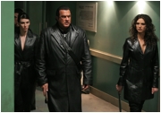 Dienst am Kunden: Ein dem Film vorangestellter Wörterbucheintrag erläutert dem fraglos unvorbereiteten Zuschauer, was eine "Infection" eigentlich ist. Dabei müßte doch seit 28 DAYS LATER klar sein, daß Infizierte grundsätzlich als blutgeile Zombies unterwegs sind und verlassene Städte auf der Suche nach Gedärm durchkämmen! Auch in AGAINST THE DARK hat ein übler Virus die (in diesem Fall recht überschaubare) Apokalypse hereinbrechen lassen und die Städte zum Spielplatz marodierender Splatterheinis gemacht. Helfen kann da natürlich nur einer: Steven Seagal, unsere geliebte Kampftonne. Ja, tatsächlich, Seagal holzt sich durch einen waschechten Horrorfilm. Das ist doch mal was Neues. Allerdings ist er in AGAINST THE DARK in etwa so lang zu sehen wie in seinem Gastauftritt in EINSAME ENTSCHEIDUNG: In der ersten Hälfte des Film tritt er so gut wie gar nicht auf, und wenn er dann mal da ist, flüstert er unvergleichliche Golddukaten der Weisheit wie etwa "We've got to move on", "Get going" oder "Run".