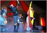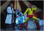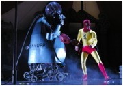 Unter anderem auf diesem Wege entgeht CAPTAIN BERLIN VERSUS HITLER dem Vorwurf, eben nur abgefilmtes Theater zu sein, die Wiedergabe eines nicht wiederzugebenden, einmaligen Bühnengeschehens. Das Drama, das sich auf den Brettern, die die Welt bedeuten, abspielt, wirkt auf der Leinwand schließlich nicht wie im Zuschauersaal. Wesentlichen Anteil am Erfolg des Films, der mehr aus ihm macht als die Dokumentation einer Aufführung, hat damit die filmische Umsetzung, wie sie sich beispielsweise im rasenden Wechsel der Schauplätze äußert: mal die Gruft Draculas in Brandenburg, das von Maschinen gesäumte Versteck von Blitzens oder das von Dracula heimgesuchte Schlafzimmer Marias. Elemente wie dieses sind natürgemäß in der Struktur der Vorlage angelegt, was die Selbstverständlichkeit des Unterfangens, CAPTAIN BERLIN VERSUS HITLER in Filmform zu präsentieren noch einmal unterstreicht. Die Künstlichkeit der Kulissenwelt und das theatralische Spiel der Darsteller, allen voran Claudia Steiger, die in mehreren Monologen ihre Pläne zur Erringung der Weltherrschaft vortragen muss und als bad girl auch in einem INDIANA JONES-Film eine gute Figur machen würde, schmiegen sich sanft an die trashige Konzeption des ganzen Spektakels an. Weshalb man CAPTAIN BERLIN VERSUS HITLER als rundum gelungene Unterhaltung mit nicht wenigen satirischen Spitzen und einer – für den deutschen (Medien-) Raum - erfrischenden Respektlosigkeit bezeichnen kann. Der Geist Hitlers wird von unserem Helden vielleicht nicht für alle Zeiten besiegt werden, diese Illusion lässt uns Buttgereit nicht, aber zumindest steht da einer auf der Bühne, der gegen ihn kämpft.