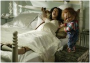 Wie auch schon in Wes Cravens NEW NIGHTMARE spielen die menschlichen Hauptdarsteller, Jennifer Tilly und der entsetzlich fade Redman, sich selbst. War Wes Cravens Film, so uneinheitlich und wirr er letztlich aussah, immerhin der Versuch eines Vexierspiels mit Realität und Fiktion, so ist dieses Prinzip bei CHUCKY ein einziger billiger Gag. Und dieser Gag geht komplett auf Kosten von Jennifer Tilly, einer überaus sympathischen und talentierten Schauspielerin, die sich hier als dumme, nuttige, verbitterte Schlampe darstellt. Warum Frau Tilly sich derart entwürdigen läßt, vermag ich nicht zu sagen; es sich anzusehen macht auf jeden Fall keinen Spaß. Die ständigen faden Scherze über ihre Lesbenszenen in BOUND sind an Verklemmtheit kaum zu überbieten, und sich breitbeinig von einer fiesen Puppe besamen zu lassen, ist vielleicht auch nicht der klügste Karriereschritt.