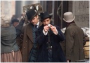Mit Robert Downey Jr., der sich für seine Rolle als Meisterdetektiv einen überzeugenden british accent angeeignet hat, hat er sich einen echten Showman ins Boot geholt: Der wiedergeborene Superstar kaspert sich mit flirrender Vehemenz durch seinen Part, dabei aber immer ausgestattet mit dem rechten Quentchen Schräglage. Intonation und Timing in seinen Dialogzeilen sorgen für Überraschungen, das Grimassieren wird ausgeglichen durch eine Zwanghaftigkeit, die Holmes' dunkle Seite durchschimmern lässt. Am pointiertesten gelingt das Ritchie und Downey Jr. in einer Szene mit Holmes im Restaurant: Sein einzigartiges Talent, Geräusche, Stimmen und Bewegungen wahrzunehmen, überfordert und quält ihn, wenn Kaskaden der Irritation auf ihn einprasseln. Downeys Leistung ist vielleicht keine preiswürdige (ebenso wenig wie es Johnny Depps tuntiges Gehampel als Jack Sparrow je war), und der Golden Globe hätte sicherlich auch Joseph Gordon-Levitt sehr glücklich gemacht, aber sie ist strahlender Anker dieses Films.
