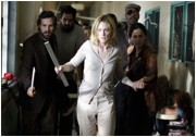 Dabei dürfte DIE STADT DER BLINDEN seinen Bildern durchaus etwas mehr Vertrauen schenken: Fernando Meirelles, der schon mit CITY OF GOD und THE CONSTANT GARDENER bewiesen hat, dass er ein eigenwilliger Stilist ist, setzt die Geschichte in eisig kalten Tönen in Szene. Die klinisch grauen Gänge des Sanatoriums strahlen vom ersten Moment an ein Gefühl klaustrophobischen Unbehagens aus, was durch den Einsatz erratischer Schärfeeffekte noch verstärkt wird; und je größere Ausmaße die Verwahrlosung und das Chaos annehmen, desto unberechenbarer wird auch die Bildgestaltung. Hier gelingen sogar einige sehr effektive Spannungsmomente, die vor allzu großer (und eigentlich angemessener) Drastik allerdings zurückschrecken. In der Coda des Films liefert Meirelles zudem ähnlich bedrückende Bilder von einer toten, halb entvölkerten Großstadt wie zuletzt sein Kollege Alfonso Cuarón in CHILDREN OF MEN. Einzig der permanente Einsatz von Überbelichtungen und Weißblenden zur Verbildlichung der Blindheit wirkt arg naiv und effektheischend.