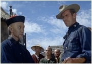 Dabei gibt es besonders im ersten Drittel immer wieder nette kleine Akzente, die erahnen lassen, was aus dem Film hätte werden können. Etwa die kakophonische Vermischung der Hymnen in den ersten Minuten. Wenn sich Heston breitbeinig vor der Gardner mit einem Bier in der einen und einem Whiskey in der anderen Hand hinstellt und rasch abwechselnd aus beiden Gläsern trinkt, dann werden Prolligkeit und Raffinesse in einem fast klassischen Ray‘schen Moment miteinander konfrontiert. Der größte "kleine" Moment ist fast schon unscheinbar: David Niven führt Charlton Heston durch eine aufgebrachte chinesische Menge, bekommt einen Stein an den Kopf geschmissen, fasst sich ein wenig später an den Nacken, begutachtet kurz den Blutfleck am weißen Handschuh und geht völlig ungerührt weiter.